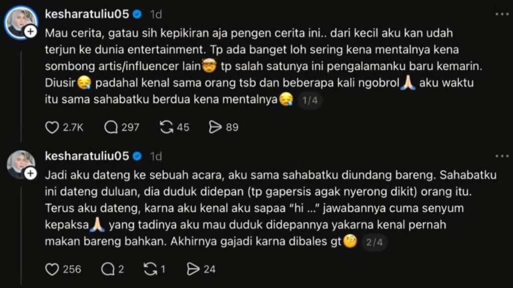 Pengalaman kurang mengenakkan dialami oleh Kesha Ratuliu saat menghadiri sebuah acara. Pada Rabu (15/4), perempuan yang dikenal sebagai aktris cilik dan influencer ini curhat di Threads, merasa ‘diusir’ oleh seorang artis atau influencer lain.